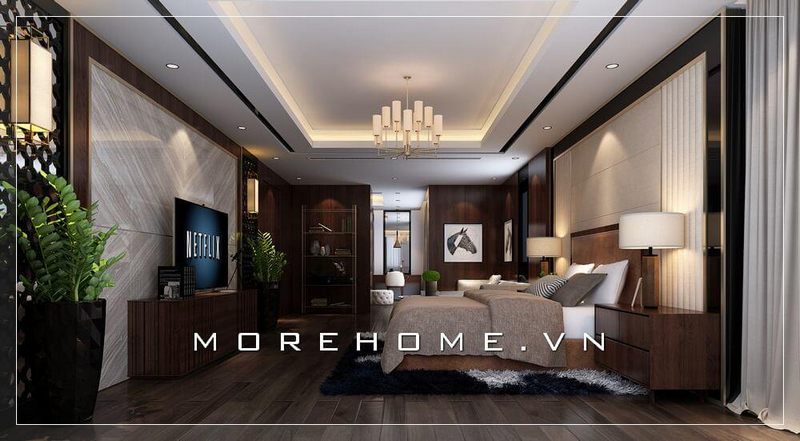 Mẫu thiết kế phòng ngủ biệt thự hiện đại mà vô cùng đẳng cấp, gam màu nâu trầm chủ đạo tạo nên không gian ấm cúng và không kém phần lãng mạn