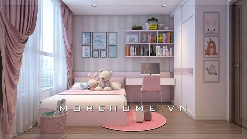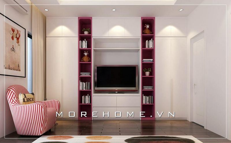 Tủ quần áo gỗ công nghiệp âm tường, tone màu trắng nhã nhặn kết hợp màu hồng nhẹ nhàng mang đến không gian phòng ngủ con thêm đẹp mắt, dễ thương hơn