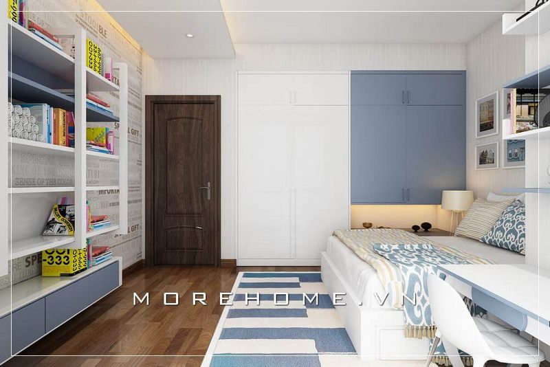 Mẫu tủ quần áo gỗ công nghiệp kết hợp bàn học với tone màu xanh năng động và tiện nghi cho không gian phòng ngủ của con