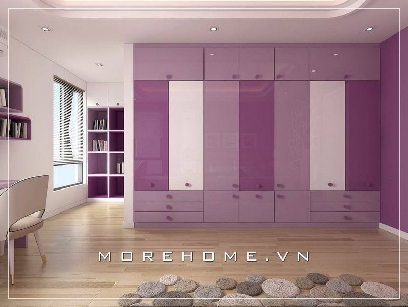 Mẫu thiết kế tủ quần áo gỗ công nghiệp được thiết kế full trần mang đến vẻ đẹp sang trọng cho phòng ngủ bé gái